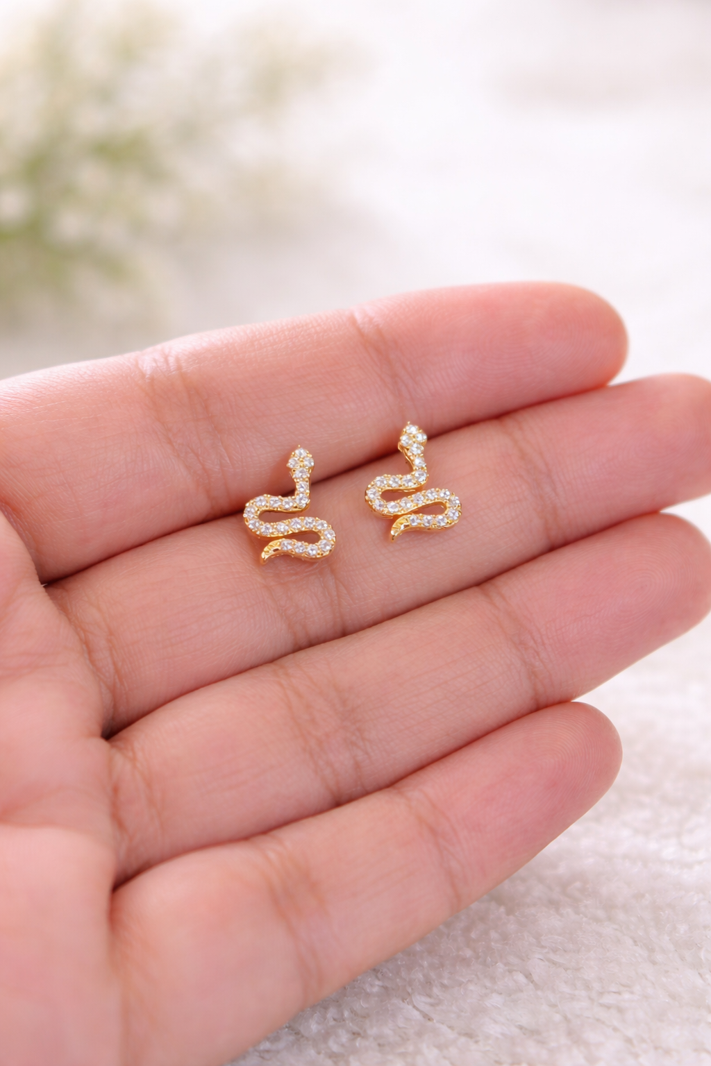 Make a bold, edgy statement with these 18k gold plated gold snake studs. Crafted from durable stainless steel with a radiant gold finish. Waterproof and anti-tarnish. Shape : snake no. of stone : 21+ colour : white