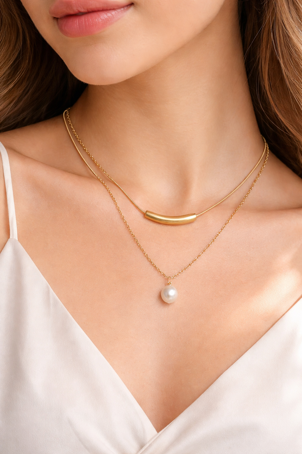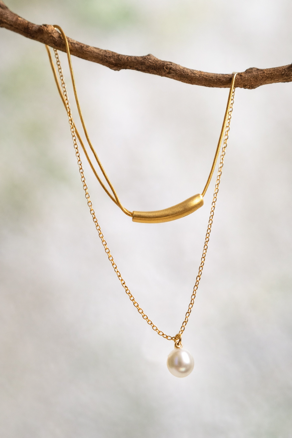 A delicate gold necklace featuring a smooth curved bar paired with a single luminous pearl drop. Designed with a layered effect, it blends modern minimalism with timeless elegance. Lightweight and versatile, this piece adds a subtle, refined touch to both everyday wear and special occasions.