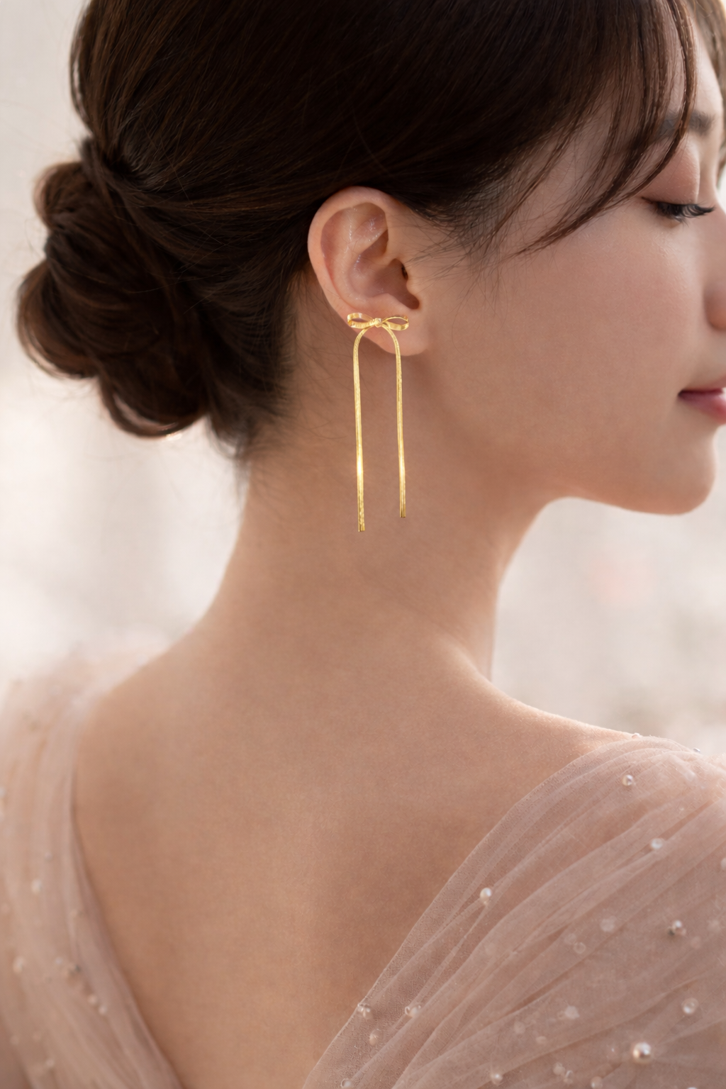 Add a touch of elegance to your look with these delicate bow-shaped drop earrings. Designed with a sleek ribbon-like finish, the long flowing strands create a graceful, minimal yet luxurious statement. Perfect for both everyday styling and special occasions, these earrings bring effortless charm and femininity to any outfit.