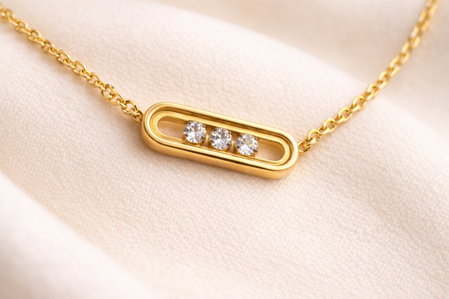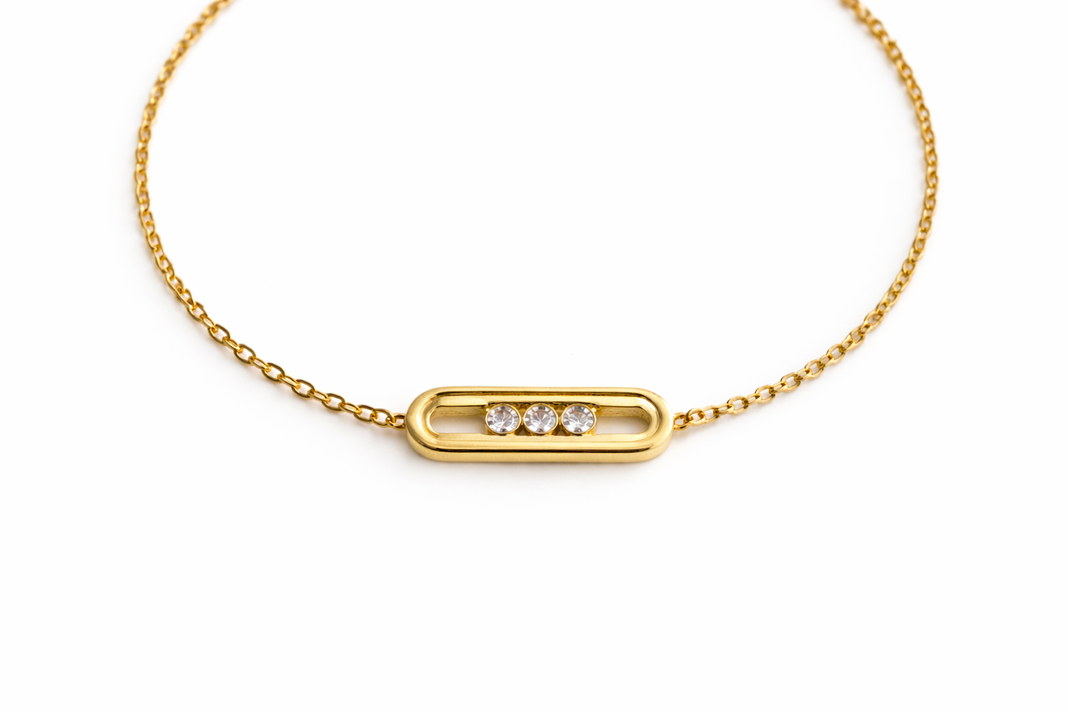 A delicate and refined piece, this bracelet features a slim gold chain accented with a sleek horizontal bar. At its center, three sparkling stones are set in a clean, minimalist design, adding just the right touch of brilliance. Lightweight and elegant, it’s perfect for everyday wear or subtle layering, bringing a timeless glow to any look.
